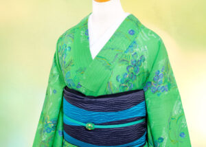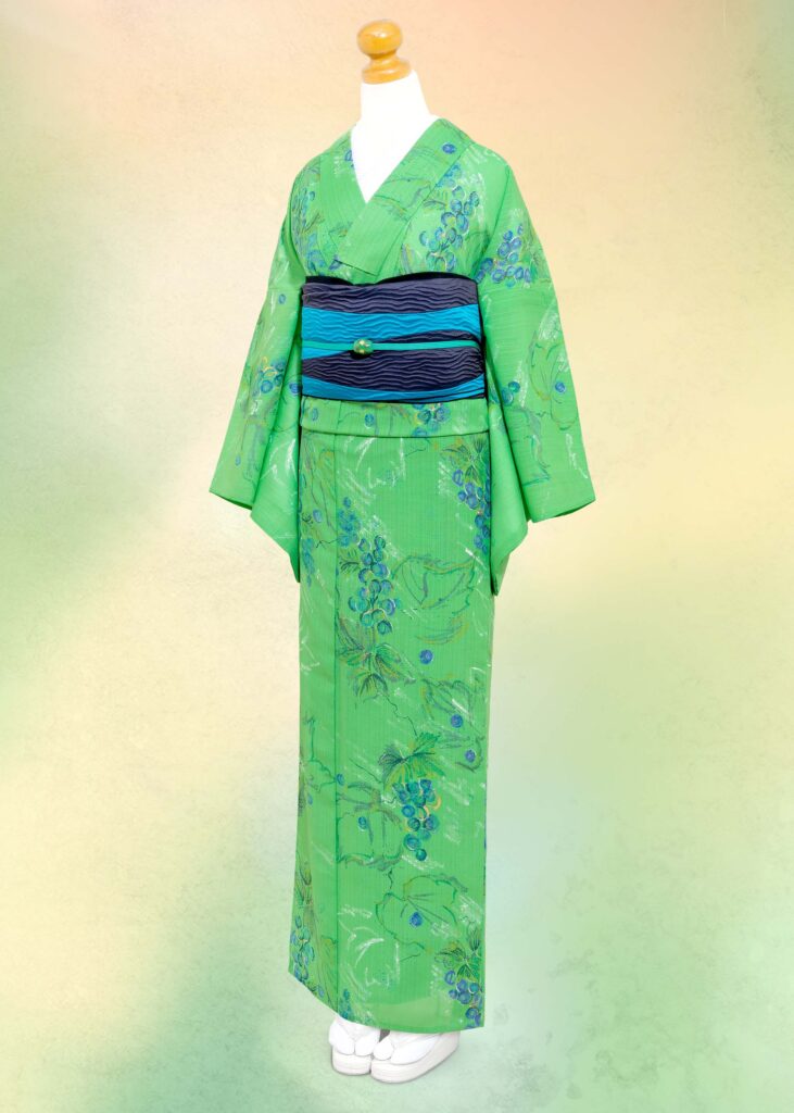 落ち着いた緑色にぶどうが描かれた秋を感じさせる浴衣に襦袢を中に着て単衣のような着こなしに。