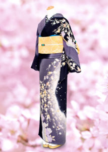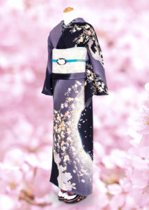 雲がたなびく空と風に揺れる夜桜でしょうか。紺地に華やかな桜模様が描かれています。上品な華やかさが銀座らしい訪問着です。