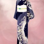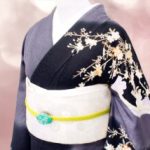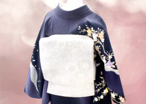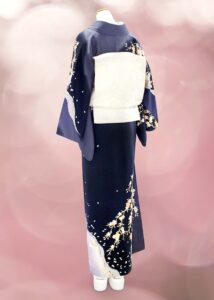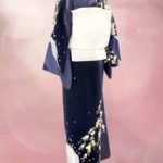 雲がたなびく空と風に揺れる夜桜でしょうか。紺地に華やかな桜模様が描かれています。上品な華やかさが銀座らしい訪問着です。