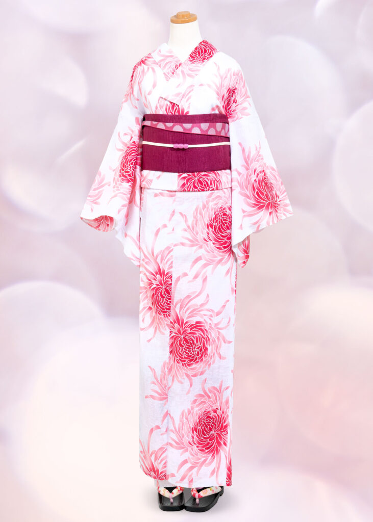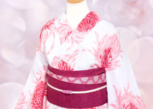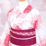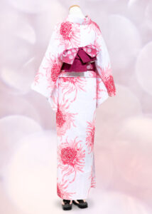 白地に菊の様な大輪の花が描かれた明るく美しい浴衣です。