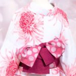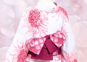 帯は濃いめのピンクで水玉柄と無地のリバーシブルです。