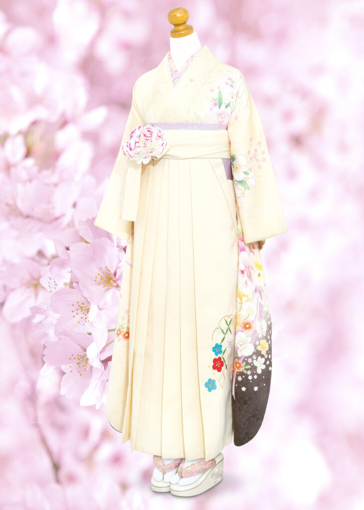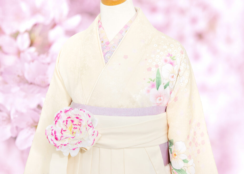 肌馴染みの良いクリーム色に胡蝶蘭やマーガレットなど洋花が描かれたモダンで可憐な振袖です。明るいアイボリーの袴を合わせた同色系統のコーディネートに淡い色合いの刺繍えりや柔らかい色味の紫色の帯、そしてアクセントに芍薬のお花飾りをプラスしました。
