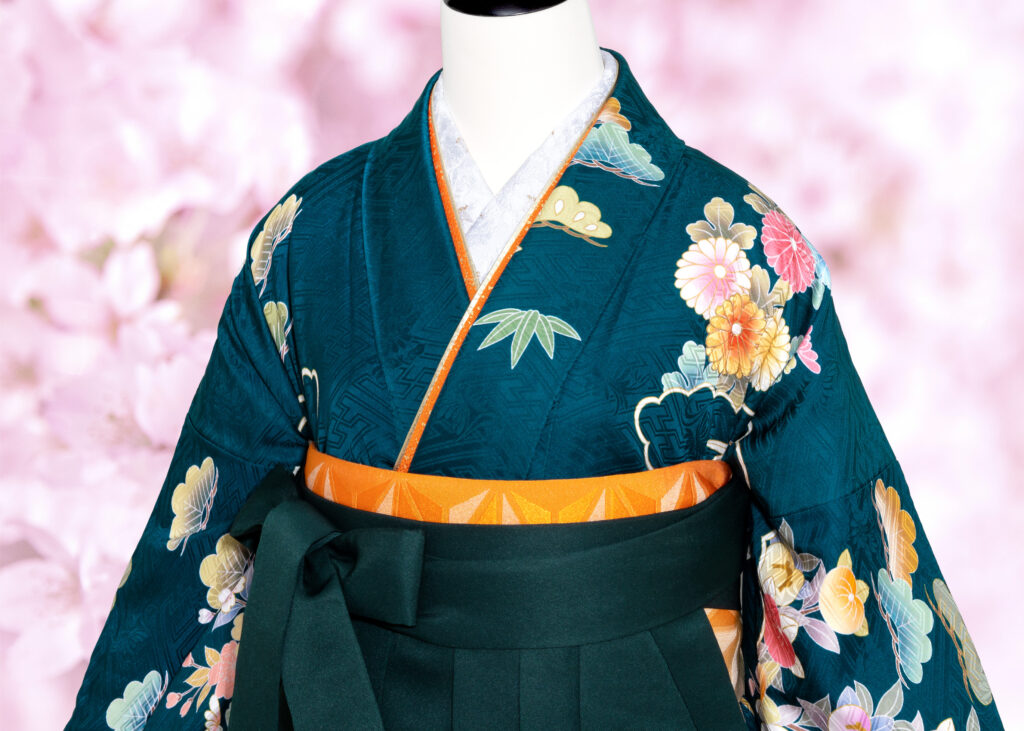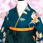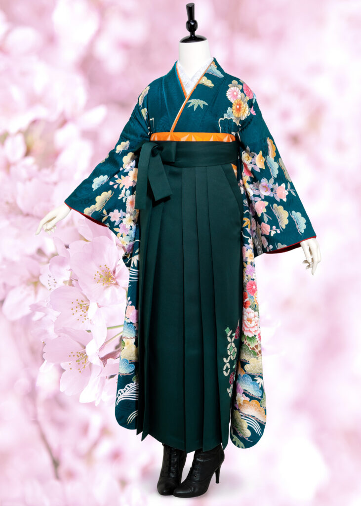 落ち着いた青緑に豪華な花々が描かれた礼装向きの振袖に、同色系統の袴を合わせたコーディネートです。