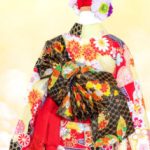 明るい黄色に色とりどりの花々や手まりが描かれた華やかな振袖です。