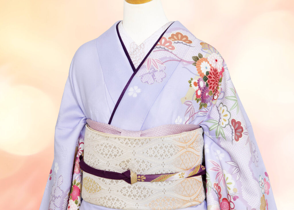 淡いピンクの刺繍えりや、ラメが華やかな帯揚げ、伊達えりと帯締めに濃い紫を合わせました♪