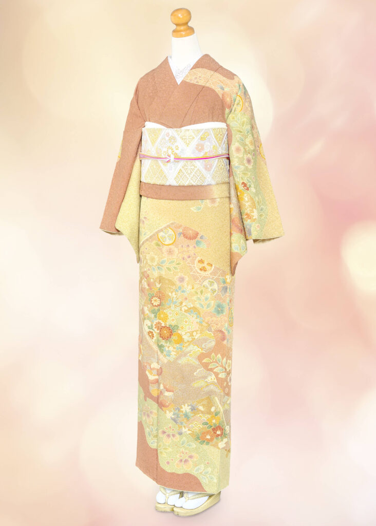 絵柄が見える部分が多いので訪問着の中でも華やかです!変わり結びに帯を締めて大人の振袖風にもお楽しみいただけます♪