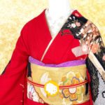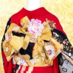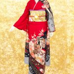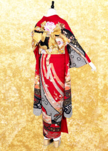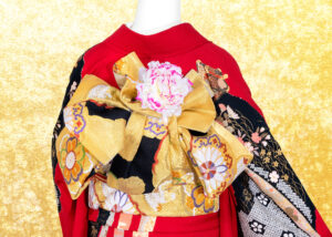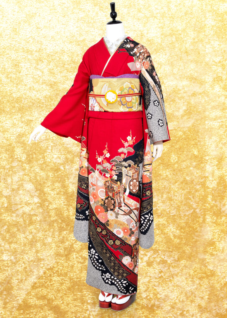 朱色と黒のコントラストがドラマチックな色合いに、古典的な熨斗や御所車、疋田柄があしらわれたクラシカルな雰囲気のある振袖です。
