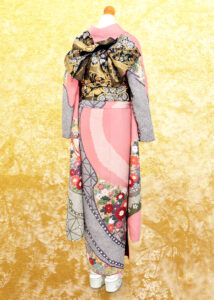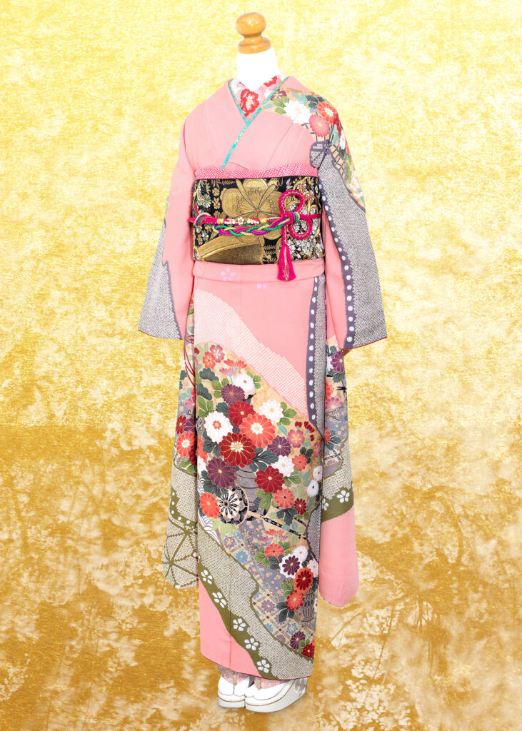 柔らかいくすみピンクに疋田柄、そして松や色とりどりの菊が溢れんばかりに乗せられた御所車が描かれた古典的な絵柄の振袖です。