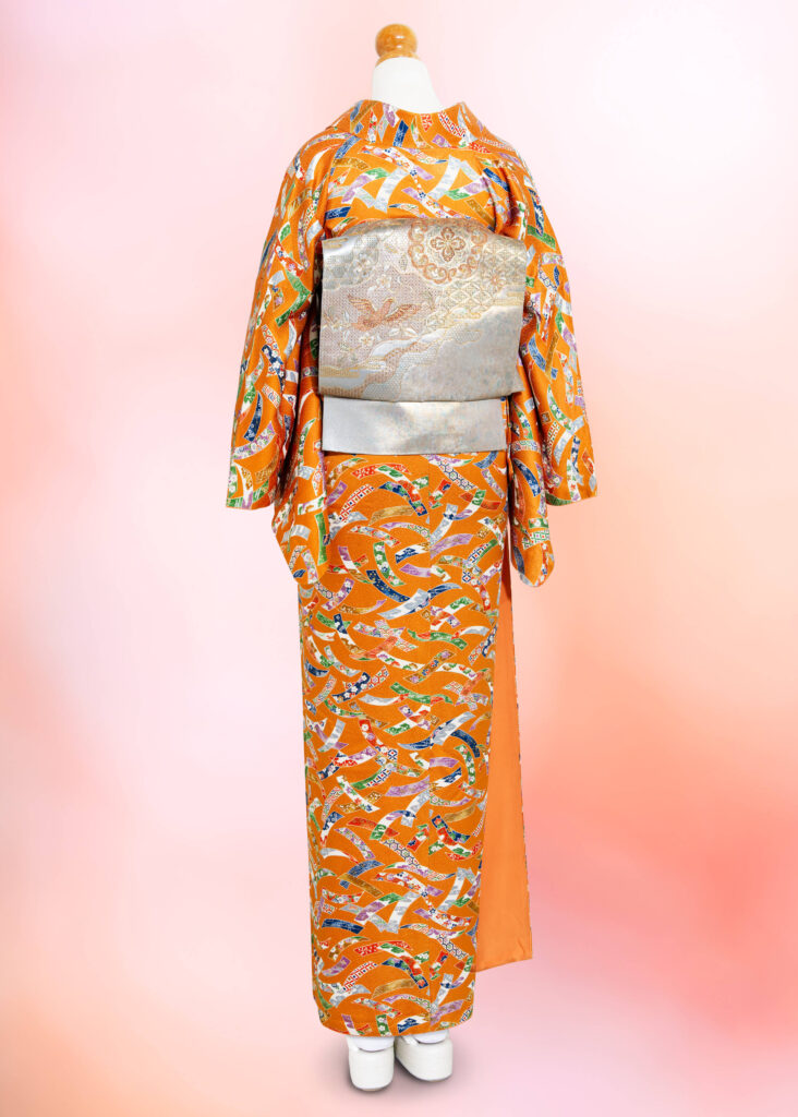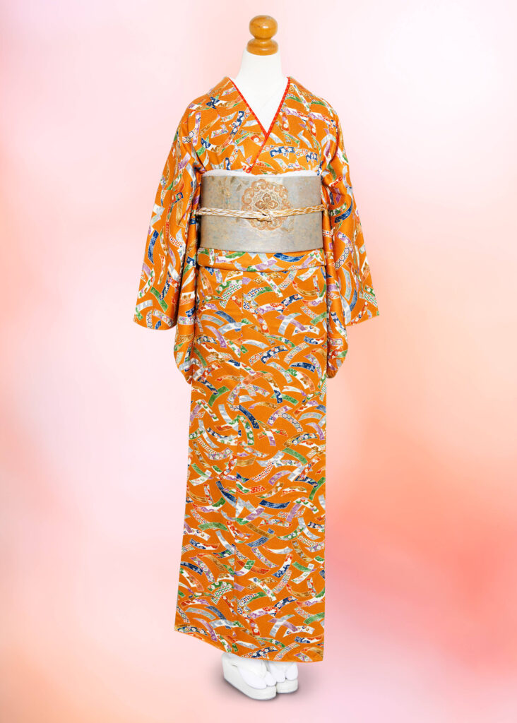 鮮やかな橙色に熨斗柄の古典的ながらも華やかな小紋で作る、歌舞伎やお食事会などのお出掛け向きのコーディネートです。
