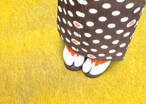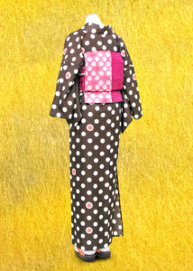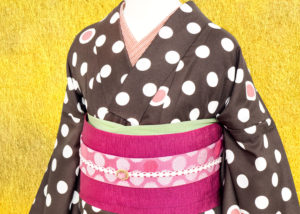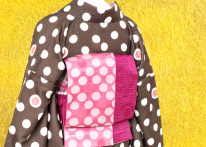 秋らしい深い茶色の地色に、所どころにピンクが散りばめられた水玉模様の単衣の小紋。