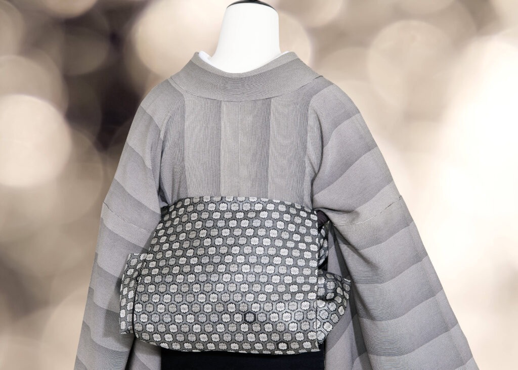 帯は礼装にも向く全通のものですが、あえて幅を狭く締めてカジュアルダウンした着こなしです。銀座結びで粋な後ろ姿に!