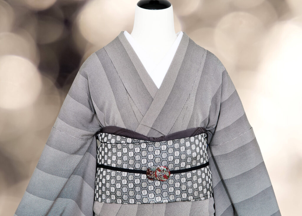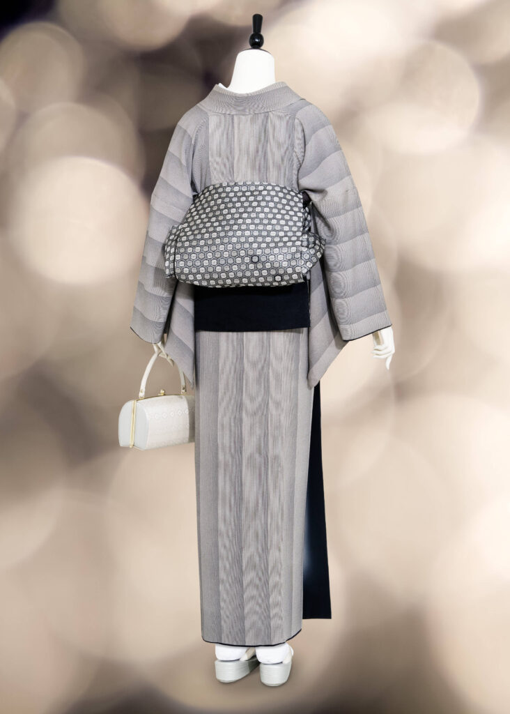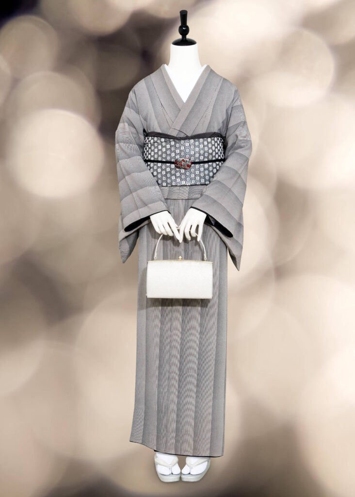 万筋がグラデーションのように見える一風変わった縞の江戸小紋で作るお出掛けコーディネートです。色味を絞ってさっぱりと粋な印象に仕上げ、着物や帯の上質さを感じられる組み合わせになっています。歌舞伎や観劇、お食事会などにオススメです!