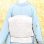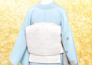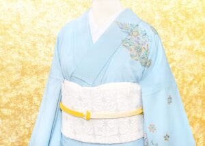 淡い水色が爽やかなこちらの付け下げは色違いでベージュもございます(コーディネートはこちら)