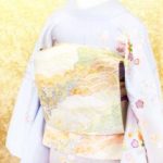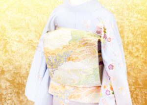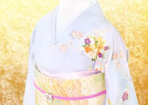 淡い色合いの中に可憐な花々が描かれ、所々にあしらわれた金糸の刺繍が確かな存在感で華やかさを添えてくれます。