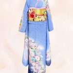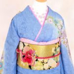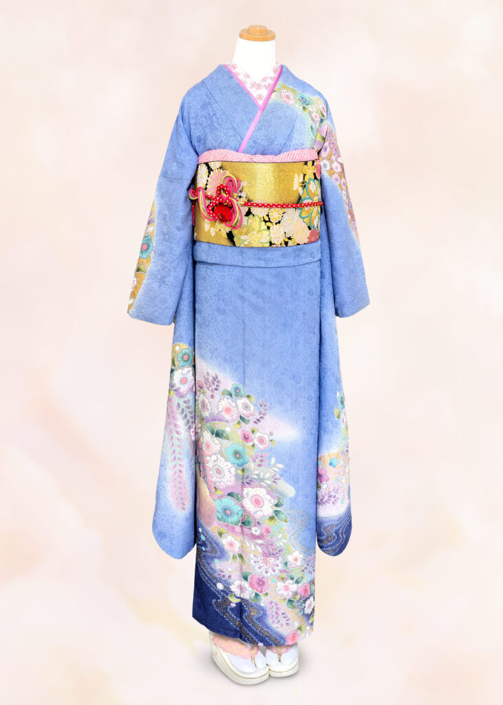 爽やかな水色に地模様が施され、まるで水面を花々が流れていくように描かれた辻が花が美しい振袖です。