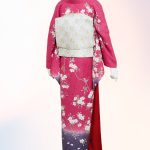 鮮やかな濃い桃色に桜の花が豪華にあしらわれた華やかな訪問着です。桜の刺繍の白えりに、白系の七宝柄の帯を合わせて、今回はさらにパーティー向けの華やかなパールの帯留めをプラスしました♪
