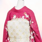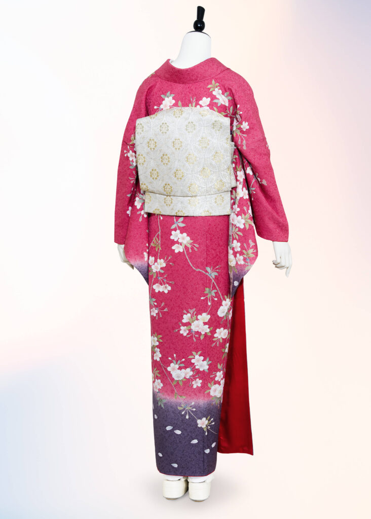 後ろ側も着物の柄が多く、とても華やかな印象になります。すっきりした帯を合わせることで着物の色柄がより引き立ちます。春のパーティーやイベントなどにおすすめです!
