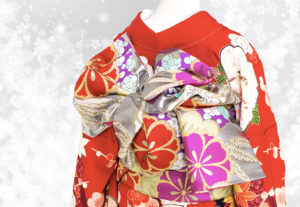 55 赤い振袖と銀色の帯