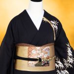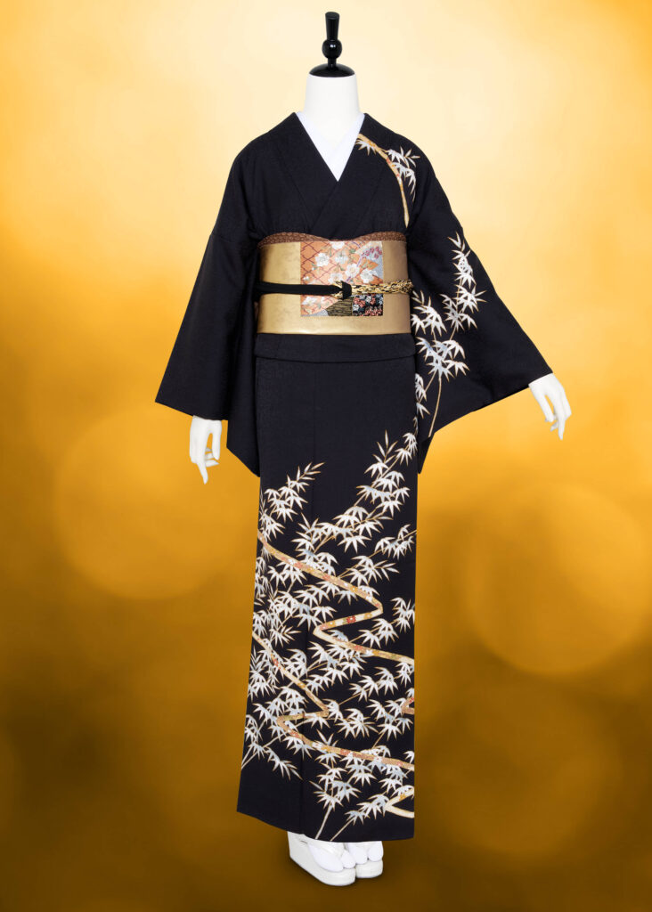 黒地に笹模様が描かれたクールなテイストの訪問着です。洗える着物ですので、お食事の機会があるパーティーなどでも安心してお召しいただけます!